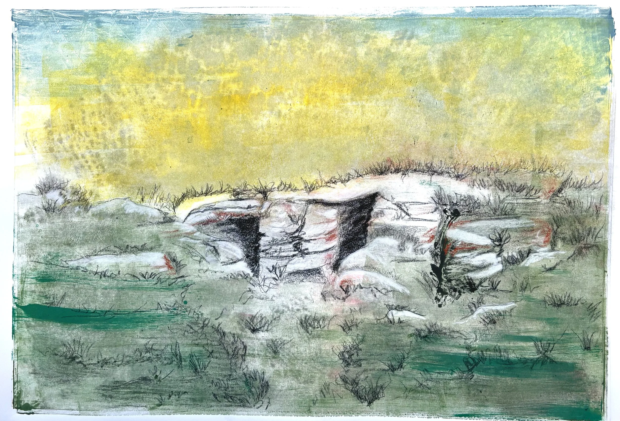 This new series explores the role of memory in the creation of sacred spaces. I revisit the sacred beauty I experienced at places of veneration, both public and personal, through the creation of monoprints that are created purely through my memory of the place. I then occasionally augment these ‘memory images’ with conté and charcoal, using reference photographs from my visits to those places. The end goal is to create a series that plays with the overlap (and divergence) between memory and recorded perception, with time and distance, and that ultimately captures the feeling of pilgrimage.